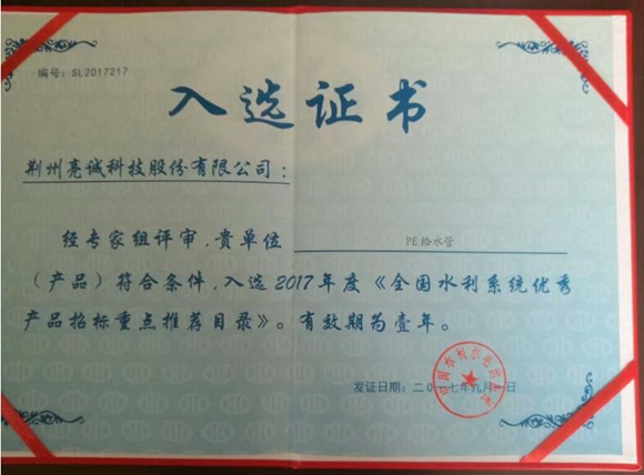 2017年度亮誠科技申請PE給水管產品最終經專家組嚴格評審,全部符合條件,入選2017年度《全國水利系統優秀產品招標重點推薦目錄》。