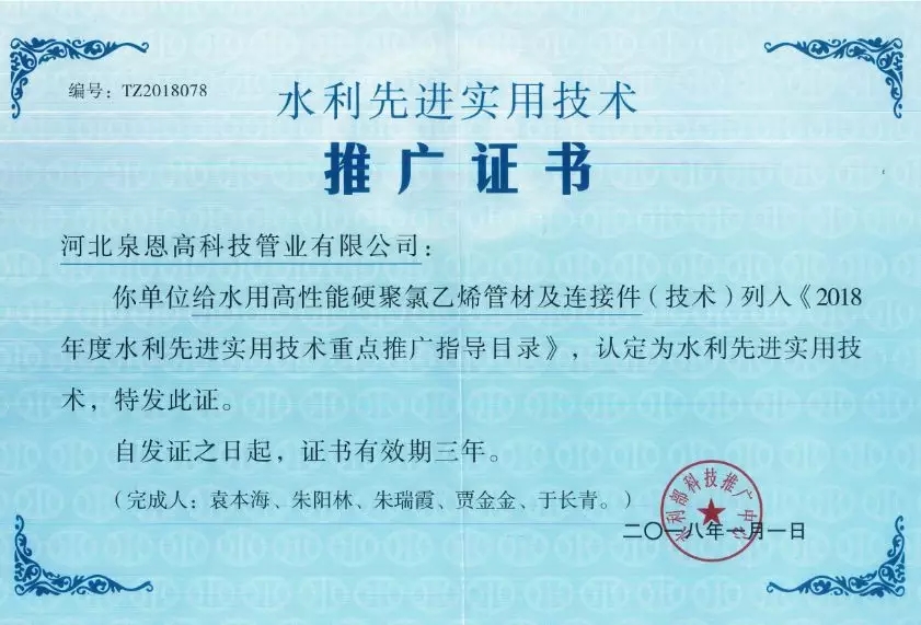 河北泉恩高科技管業有限公司,“給水用高性能硬聚氯乙烯管材及連接件(技術)”被認定為 “水利先進實用技術”,列入《2018年度水利先進實用技術重點推廣指導目錄》。
