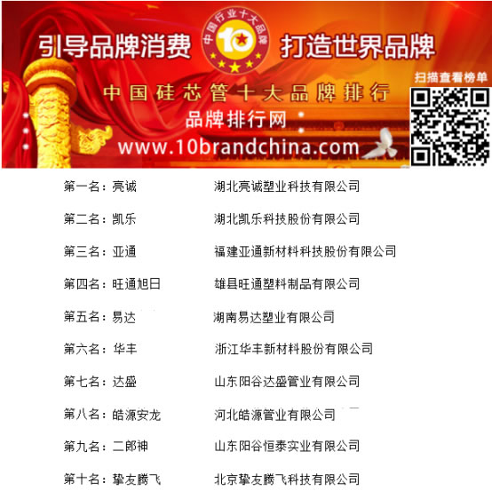 “中國硅芯管評選”是由品牌排行網主辦,全網范圍最廣、規模的品牌綜合實力排名評選。活動得到了數十萬網友投票與點評,吸引了國內路橋物資采購和交通、通信運營商的積極參與,被新浪、網易、新華網、中國網、搜狐等70多家知名網媒高度關注,是行業影響力的評選。