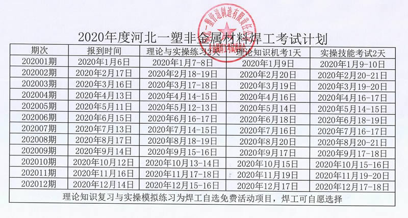 河北一塑管道制造有限責任公司非金屬焊工考試委員會(以下稱本考委會、考委會),是隸屬于河北一塑管道制造有限責任公司的獨立考試機構。本考委會依據《中華人民共和國特種設備安全法》國家主席令(2013)4號、《特種設備安全監察條例》國務院令(2009)549號、《特種設備作業人員監督管理辦法》質檢總局(2011)140號、《特種設備作業人員考核規則》TSG Z6001—2019、《特種設備焊接操作人員考核細則》TSG Z6002-2010等有關法規與規范組建,是經中國腐蝕與防護學會高分子管道和容器專業委員會專家委員會鑒定評審,河北省質量技術監督局核準成立的非金屬焊工考試機構。