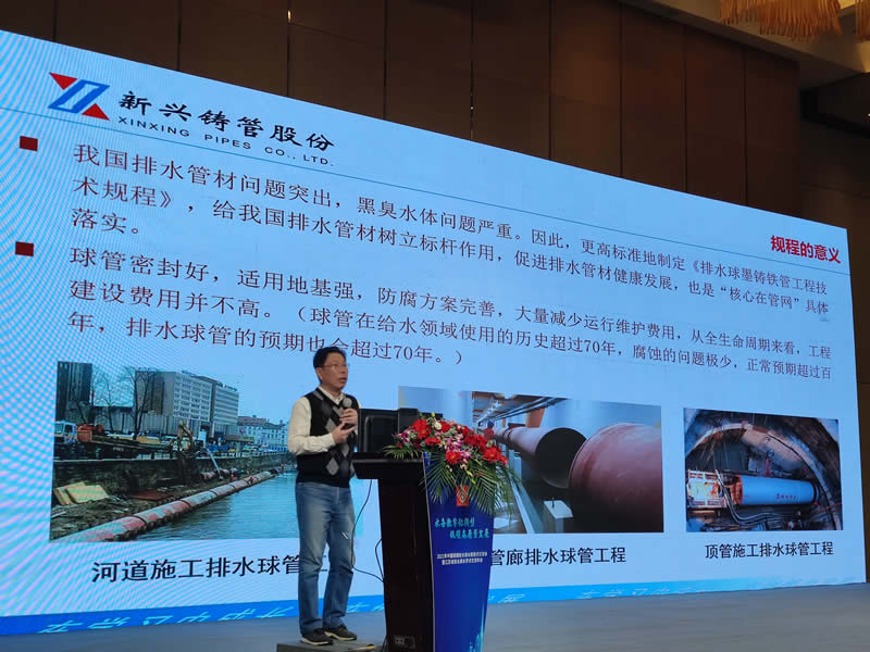 大會聚焦“疫情防控下的水務應對,低碳理念、水務數字化轉型”的主題,分享學術交流,解讀行業政策,探討發展趨勢。技術專家張紅斌在市政分會場做了《雙碳背景下優質飲用水管道的選擇》主題報告,對市場上常見的飲用水管道做了對比,重點介紹了鋼塑復合管和不銹鋼管材優異的防腐、承壓性能,接口安全穩定,為二次供水提供更優質的管材選擇。新興鑄管的技術專家李華成在主會場對《排水球墨鑄鐵管道工程技術規程》進行了詳細的解讀和宣貫,《排水球墨鑄鐵管道工程技術規程》的發布,為球墨鑄鐵污水管的應用和推廣提供了技術支持和標準依據。