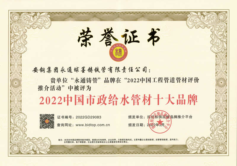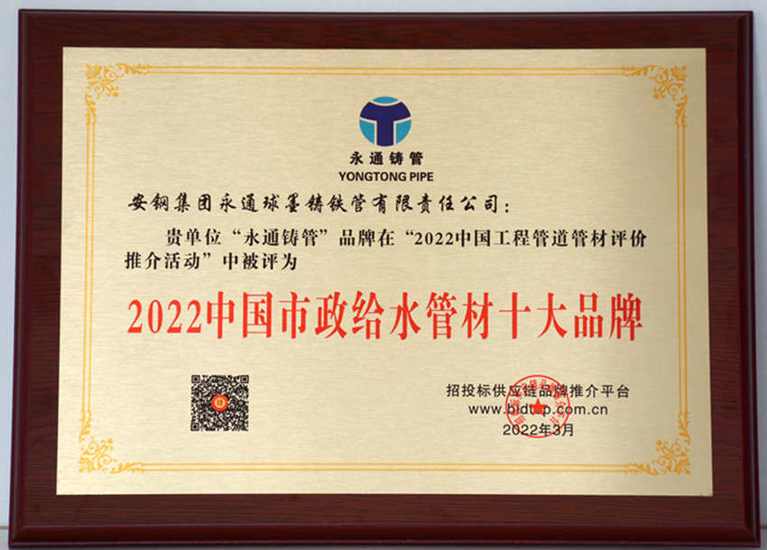 《安鋼》訊 4月11日,永通公司傳來喜訊,“永通鑄管”品牌在“2022中國工程管道管材評(píng)價(jià)推介活動(dòng)”中斬獲“2022中國市政給水管材”、“2022政府采購工程管材”兩個(gè)重量級(jí)獎(jiǎng)項(xiàng)。