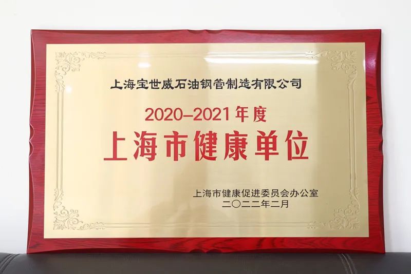 近日,寶世威石油鋼管制造有限公司喜獲上海市健康促進委員會頒發的“2020-2021年度上海市健康單位”榮譽稱號。