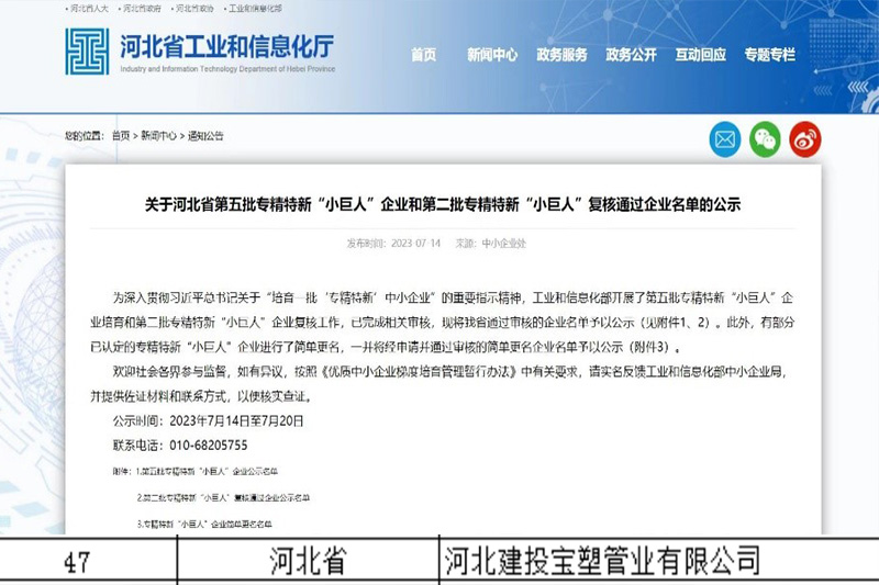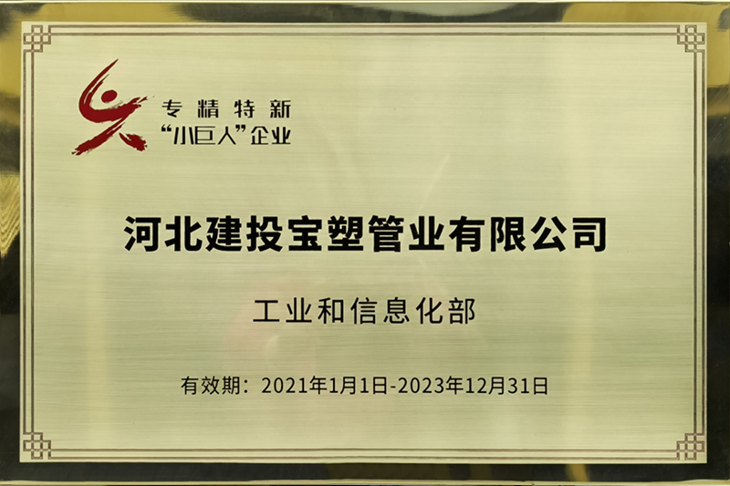 近年來,為加快解決技術難題,國家大力扶持“專精特新”企業,高度重視中小企業發展。河北建投寶塑管業有限公司于2021年被工信部授予了專精特新“小巨人”企業榮譽稱號。