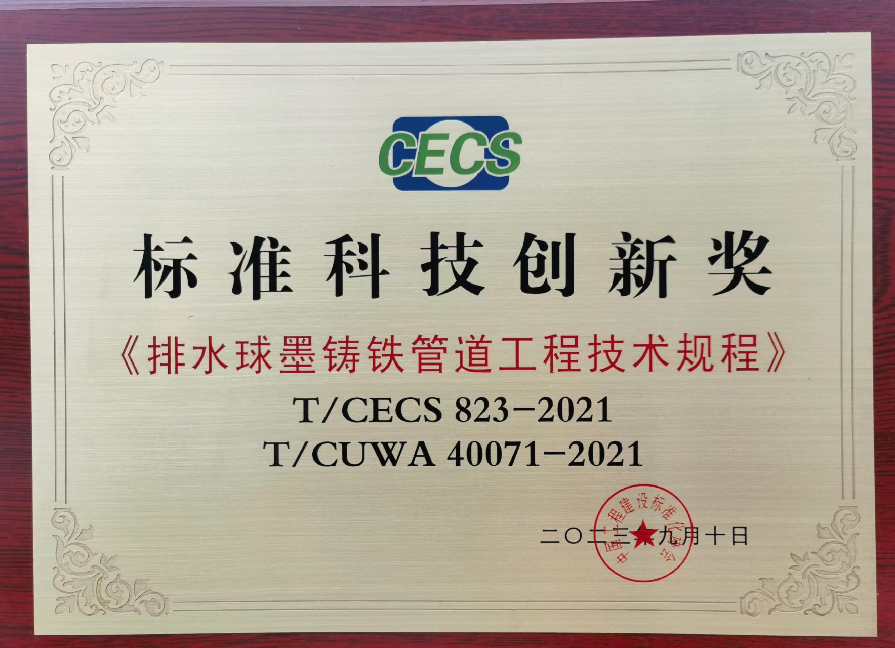 近日,中國工程建設標準化協會在南寧市舉辦了“2023年度標準科技創新獎頒獎大會”,大會表彰了2023年度標準科技創新獎獲獎項目并舉行了頒獎典禮。由新興鑄管、上海城建設計院、北京市政院、東北市政院、常州排水管理處、珠海水務、中州水務等共同編制的《排水球墨鑄鐵管道工程技術規程》榮獲“標準科技創新獎”。