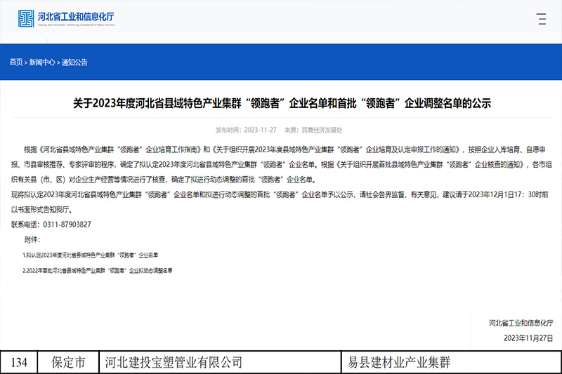 11月27日下午,河北省工業和信息化廳發布了2023年度縣域特色產業集群“領跑者”企業名單和首批“”企業調整名單。河北建投寶塑管業有限公司喜獲“產業集群領跑者企業”稱號。