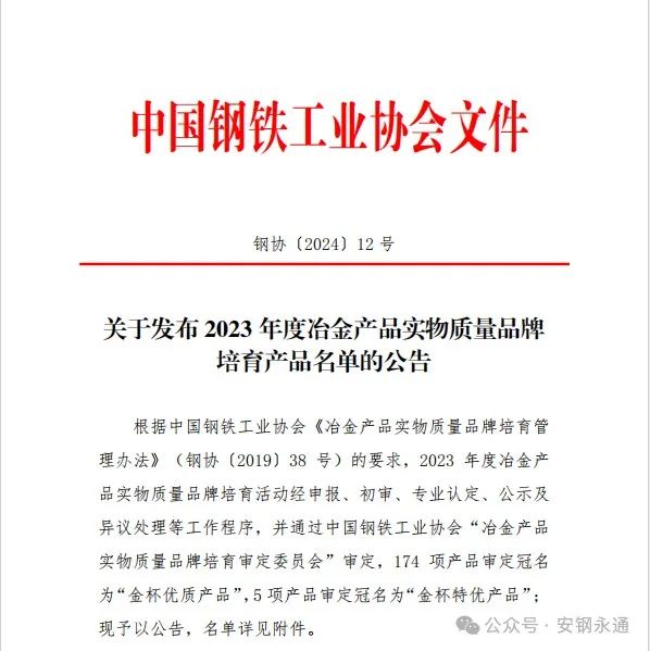 冶金產(chǎn)品實(shí)物質(zhì)量品牌培育認(rèn)定是國(guó)內(nèi)一項(xiàng)針對(duì)鋼鐵行業(yè)實(shí)物產(chǎn)品質(zhì)量進(jìn)行認(rèn)定的評(píng)價(jià)活動(dòng),也是我國(guó)鋼鐵產(chǎn)品實(shí)物質(zhì)量水平認(rèn)定的獎(jiǎng)項(xiàng),被譽(yù)為行業(yè)內(nèi)的“奧斯卡”。