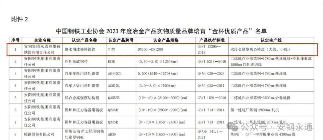 熱烈祝賀安鋼集團(tuán)永通球墨鑄鐵管有限責(zé)任公司球墨鑄鐵管產(chǎn)品審定冠名為“金杯優(yōu)質(zhì)產(chǎn)品”!