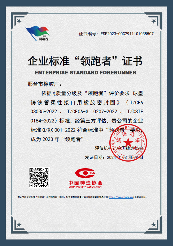 邢臺市橡膠廠入選的企業(yè)標(biāo)準(zhǔn)Q/XX 001-2022《球墨鑄鐵管和管件用柔性接口橡膠密封圈》,在2022年首次被評為企業(yè)標(biāo)準(zhǔn)“領(lǐng)跑者”,其技術(shù)指標(biāo)均優(yōu)于國內(nèi)外相關(guān)標(biāo)準(zhǔn),在國內(nèi)球墨鑄鐵管柔性接口密封圈行業(yè)中一直處于領(lǐng)跑者地位。