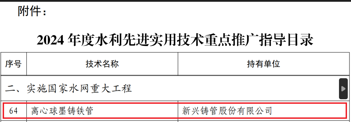 為推動(dòng)水利行業(yè)采用先進(jìn)實(shí)用技術(shù),切實(shí)提高水利行業(yè)技術(shù)水平,有力支撐新階段水利高質(zhì)量發(fā)展,水利部科技推廣中心近期組織開展了《2024年度水利先進(jìn)實(shí)用技術(shù)重點(diǎn)推廣指導(dǎo)目錄》技術(shù)征集活動(dòng),新興鑄管股份有限公司的離心球墨鑄鐵管產(chǎn)品憑借優(yōu)異的表現(xiàn)成功入選。