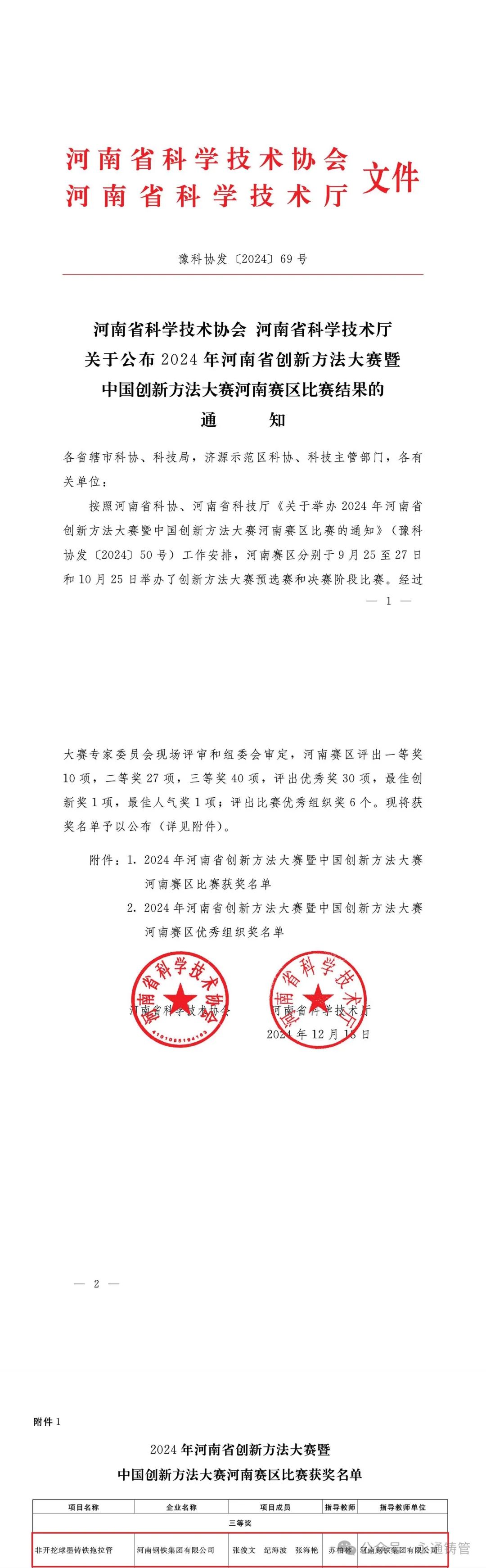 近日,河南省科學技術協會、河南省科學技術廳公布了《2024年河南省創新方法大賽暨中國創新方法大賽河南賽區比賽結果》,永通公司“非開挖球墨鑄鐵拖拉管”榮獲河南賽區三等獎。