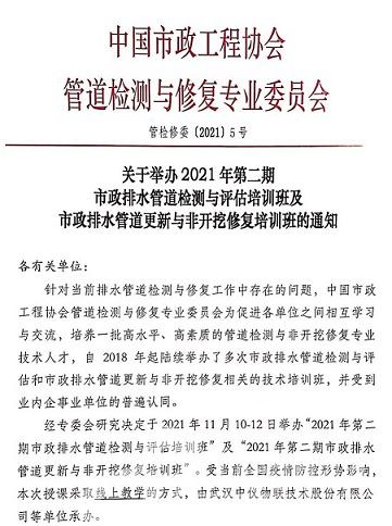 2021-10-09關于舉辦2021年第二期市政排水管道檢測與評估培訓班及市政排水管道更新與非開挖修復培訓班的通知 附件: 一、組織機構 (一)指導單位 中國市政工程協會 (二)主辦... 【詳情】
