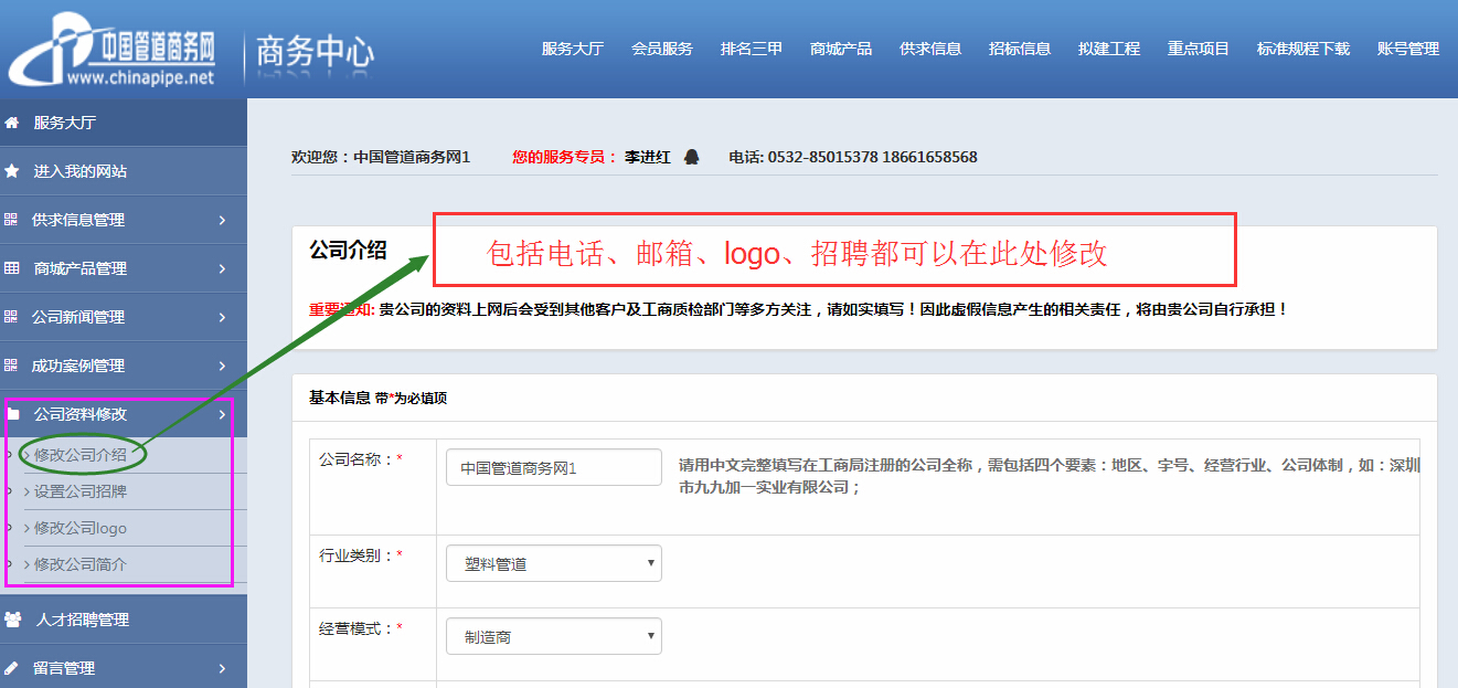登陸后,點擊“會員資料修改”即可,包括企業(yè)LOGO、電話、聯(lián)系人、等資料都可以即時修改: