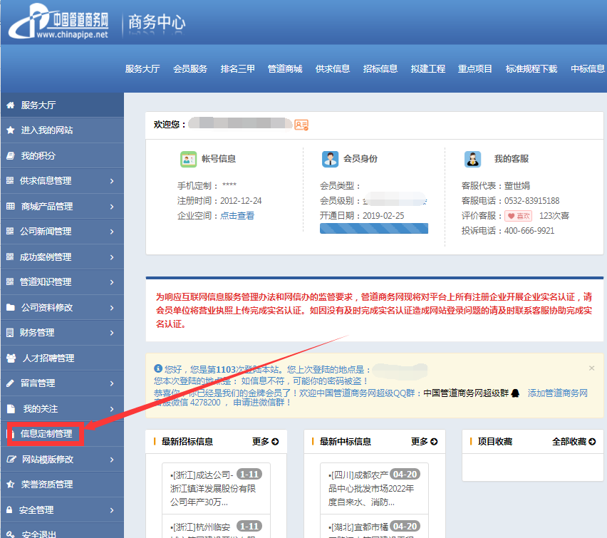 2、在會員中心頁面, 選擇【信息定制管理】:https://www.www.yezhuai.cn/user/