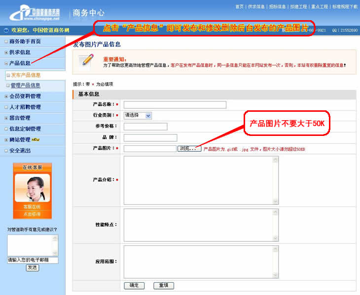 對于要上傳的產品圖片的圖片格式是 gif 或 jpg ,尺寸要小于20K.