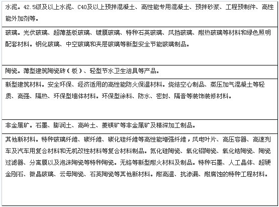 主要內容:實施新材料產業發展戰略,大力推進技術產業化及制造規模化。積極發展太陽能光伏玻璃、超薄屏顯基板玻璃等特種玻璃,特種玻璃纖維、碳纖維、碳化硅纖維等高性能無機纖維,風電葉片、高壓容器等纖維增強復合材料制品,氮化硅陶瓷、氧化鋁陶瓷、石英陶瓷以及陶瓷分離膜等特種陶瓷,人工晶體、超硬材料和特種石墨等其他新材料。