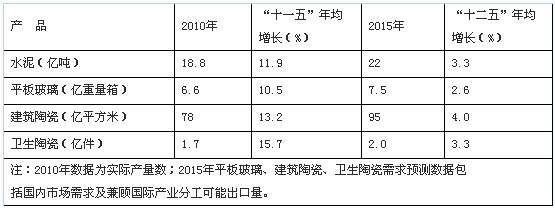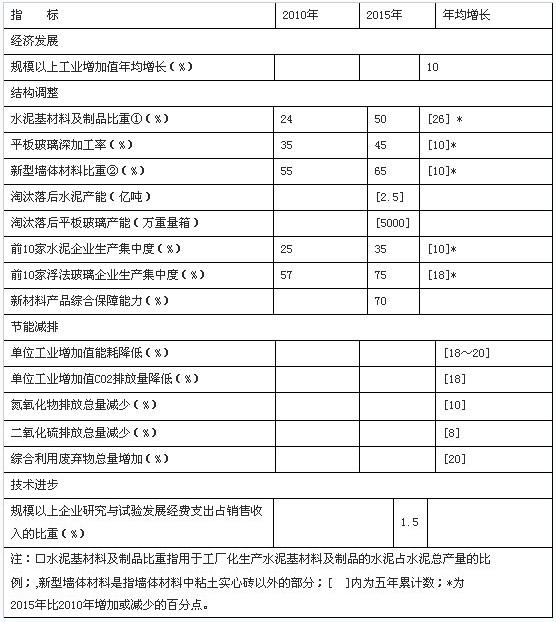 “十二五”期間,建材工業增加值年均增長10%以上。大力淘汰落后的水泥、平板玻璃產能。單位工業增加值能耗和二氧化碳排放降低18%~20%,主要污染物排放總量減少8%~10%,實現穩定達標排放。協同處置推廣應用,綜合利用固體廢棄物總量提高20%。行業安全生產和職業健康水平進一步提高,生產安全事故和職業危害得到有效防范。規模以上企業生產經營管理和信息化水平大幅提升,水泥、玻璃行業重點企業信息系統集成技術達到世界先進水平。生產集中度進一步提高,1~2家企業進入世界500強。