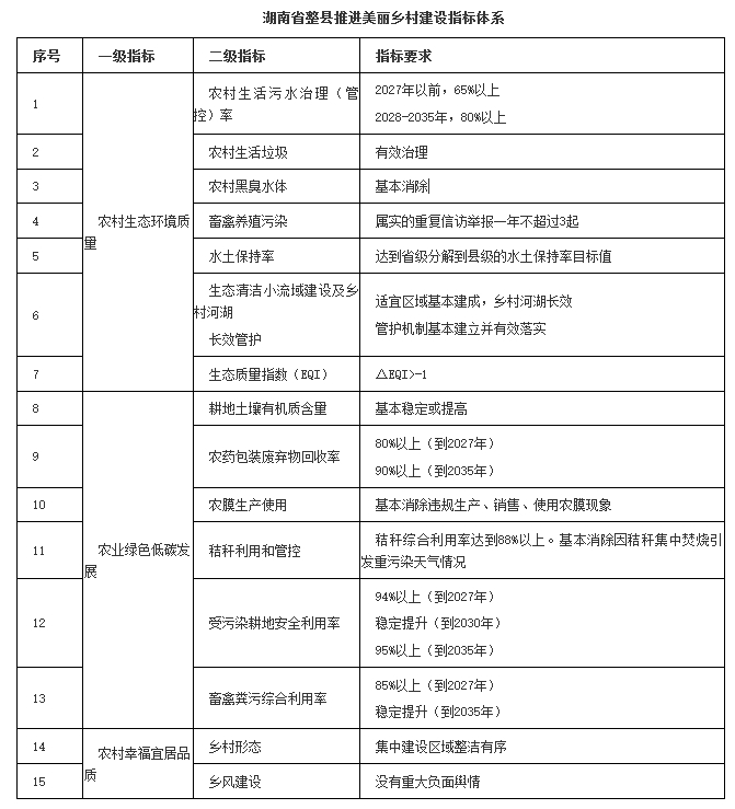 日前,湖南省生態環境廳聯合省農業農村廳、省發展和改革委員會等九部門,印發《湖南省美麗鄉村建設工作方案》(簡稱《工作方案》)。到2027年,全省美麗鄉村整縣建成比例達到40%(長株潭地區整縣建成比例達到60%、洞庭湖區整縣建成比例達到50%)。到2030年,全省美麗鄉村整縣建成比例力爭達到65%。到2035年,美麗鄉村基本建成。