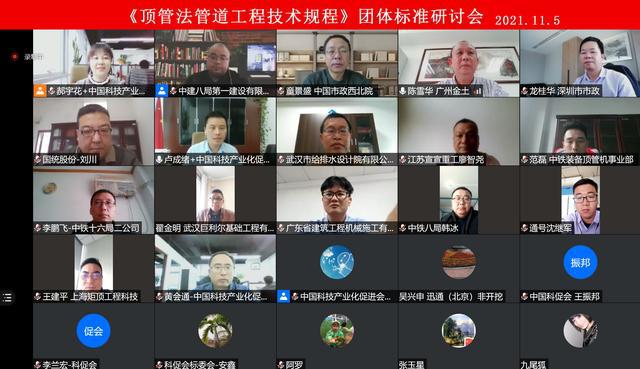 2021年11月5日,由中國科技產(chǎn)業(yè)化促進(jìn)會(huì)組織,深圳市市政工程總公司、廣州金土巖土工程技術(shù)有限公司聯(lián)合提出的《頂管法管道工程技術(shù)規(guī)程》團(tuán)體標(biāo)準(zhǔn)征求意見會(huì)通過線上會(huì)議形式召開。來自中國市政工程西北設(shè)計(jì)研究院有限公司、通號(鄭州)電氣化局有限公司、中鐵八局集團(tuán)電務(wù)工程有限公司、新疆國統(tǒng)管道股份有限公司、中建八局建設(shè)有限公司、中建二局土木工程集團(tuán)有限公司、騰達(dá)建設(shè)集團(tuán)股份有限公司、武漢市給排水工程設(shè)計(jì)院有限公司、中鐵工程裝備集團(tuán)有限公司、長江勘測規(guī)劃設(shè)計(jì)研究有限責(zé)任公司、迅通(北京)非開挖建設(shè)工程有限公司等單位近30位行業(yè)內(nèi)專家、學(xué)者參加了此次會(huì)議。