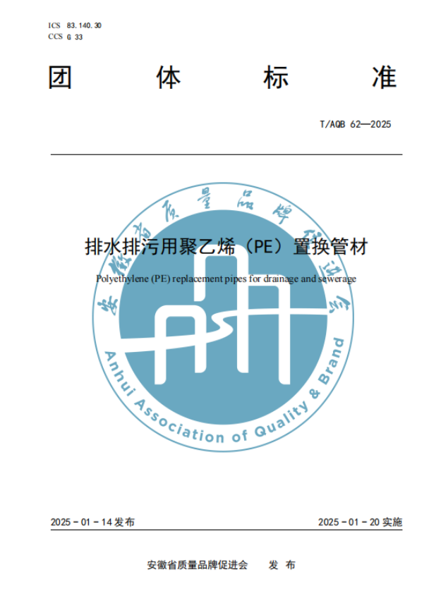 2025 年 1 月 14 日,《排水排污用聚乙烯(PE)置換管材》團體標準正式發布,并于 2025 年 1 月 20 日開始實施。